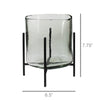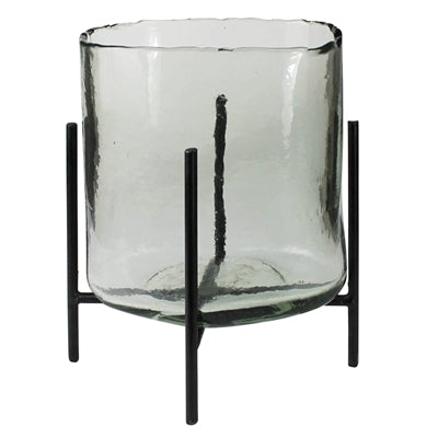 In unexpected oval shapes this recycled glass hurricane aloft in an iron stand flaunts versatility in holding a candle, bedecked with a floral arrangement or chilling a bottle of champagne. .Dimensions: 6.5 x 4.75 x 7.75