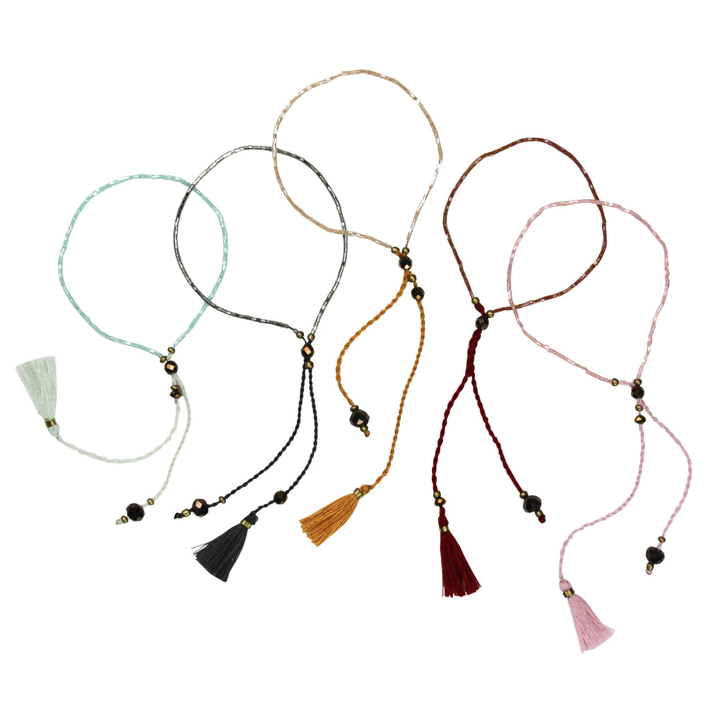 Set of 5 bracelets with mineral-tone beads, each showcasing a unique blend of earthy colors and textures. These stacked pieces add a natural, boho vibe to any outfit, perfect for layering or wearing individually for a subtle, elegant touch. $8 each, 3ΓÇ¥ diameter, adjustable.Dimensions: 0 x 0 x 0