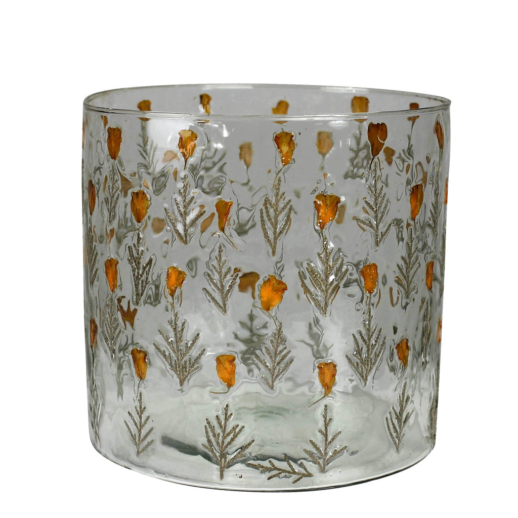 Earthen materials appropriated from nature are forever conserved in this enameled hurricane. Orange petals and juniper stems form a pattern are enameled onto simple glass silhouettes presenting an intriguing garden luminary. .Dimensions: 6 x 6 x 5.75