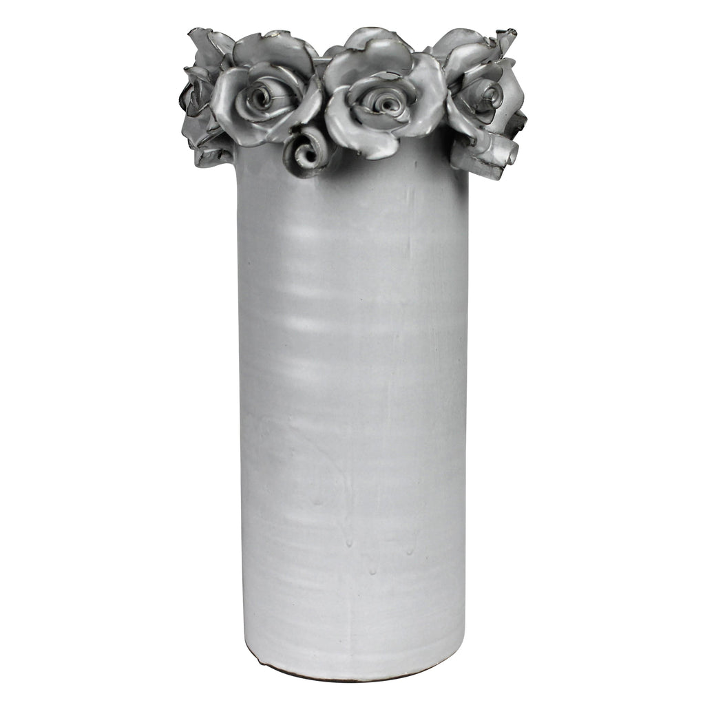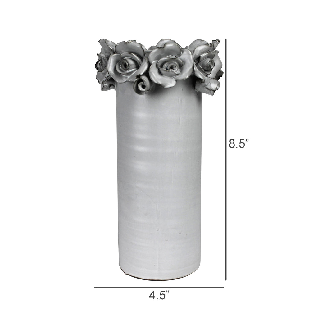 A ceramic cylinder is adorned with a crown of ceramic roses, ready to compliment whichever variety of bloom is right for the occasion. .Dimensions: 4.5 x 4.5 x 8.5