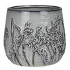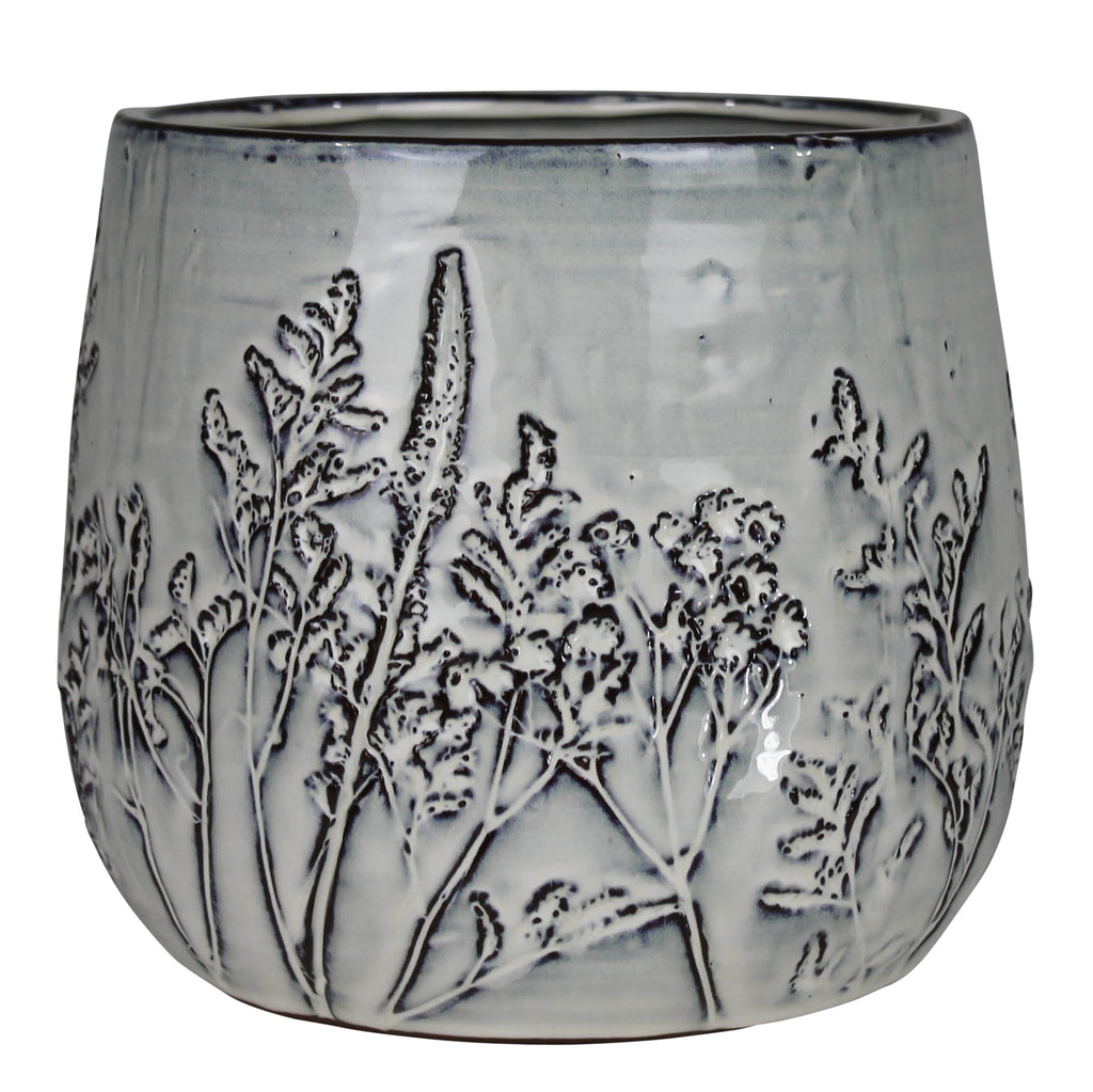 Ceramic cachepot with a soft white glaze, adorned with delicate wildflower details. Its subtle design brings a natural, serene touch to any space, perfect for housing plants or as a charming decorative accent in both modern and rustic settings. .Dimensions: 7 x 7 x 7