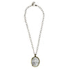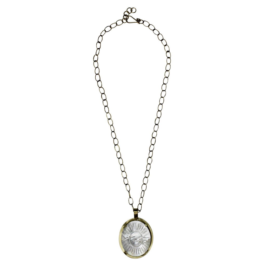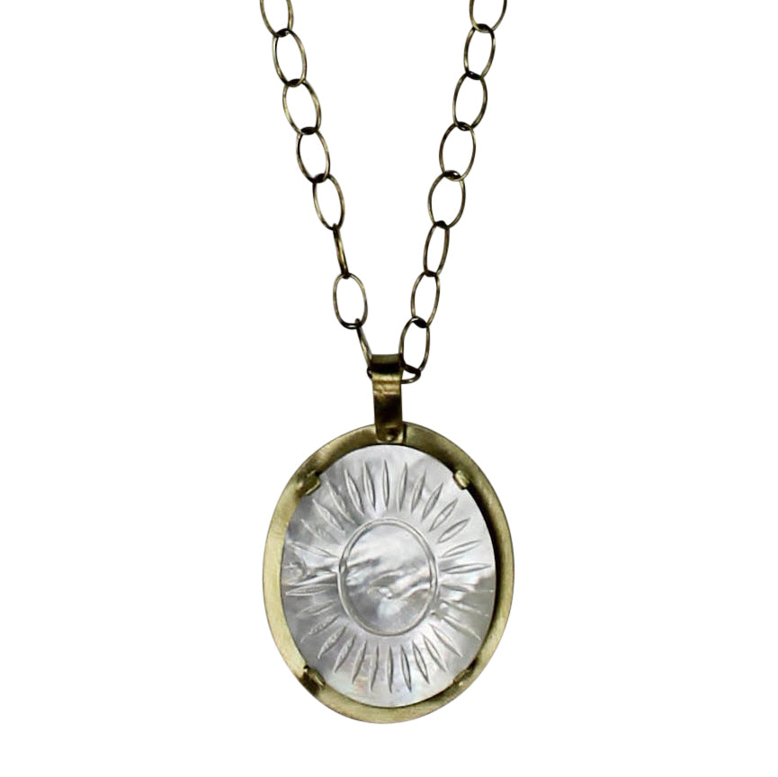 Zahara Pendant with a Mother of Pearl flower, set in brass. Its elegant floral design and iridescent inlay create a timeless, nature-inspired piece, adding a delicate touch of sophistication to any look. 2" pendant 18" adjustable chain.Dimensions: 0 x 0 x 0