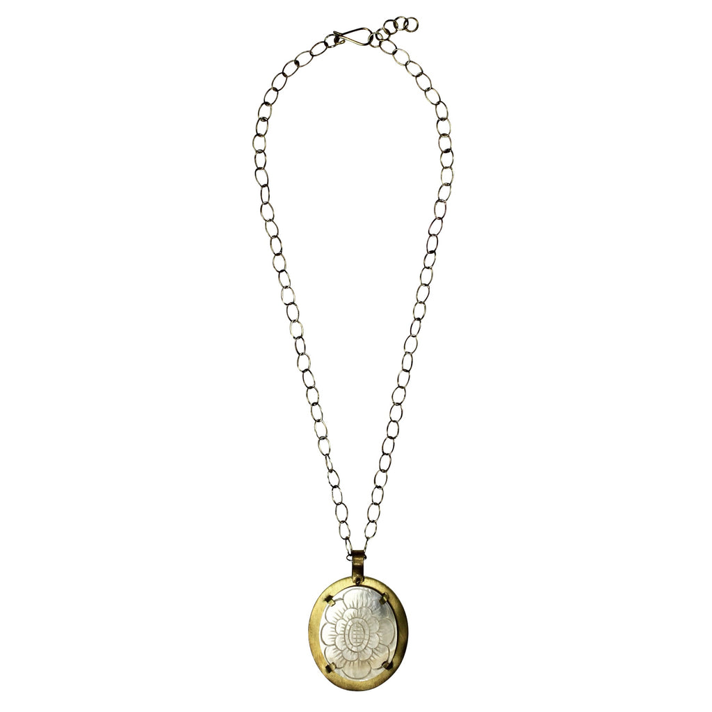 Zahara Pendant featuring a Mother of Pearl sunburst design, set in brass. The radiant, sunburst pattern adds a striking, luminous touch, creating a bold yet elegant statement piece for any jewelry collection. 2" pendant 18" adjustable chain.Dimensions: 0 x 0 x 0